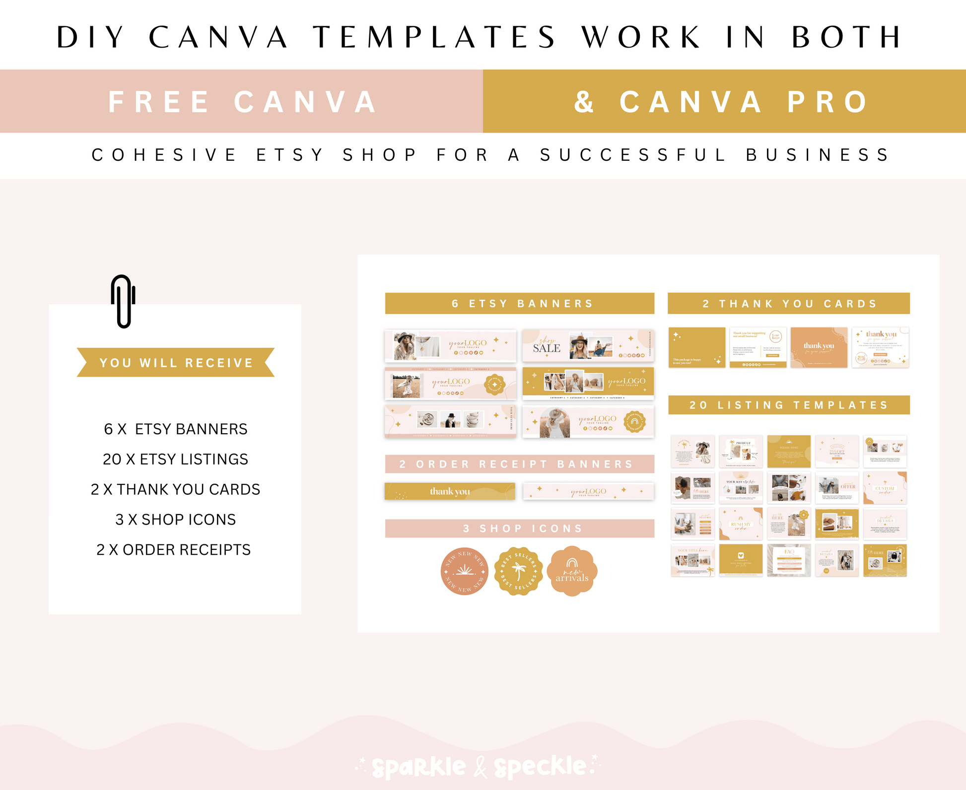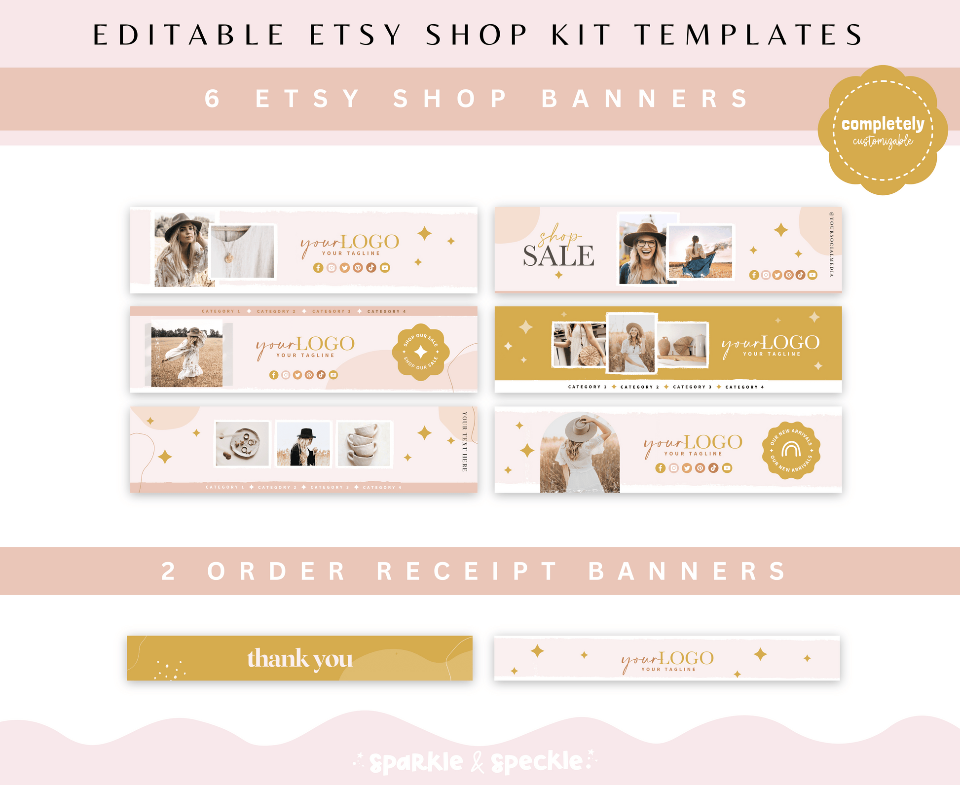 Transform your new Etsy shop with this earthy tones boho Etsy shop branding kit featuring banner listings, thank you cards, shop icons and Etsy receipt templates editable in Canva.