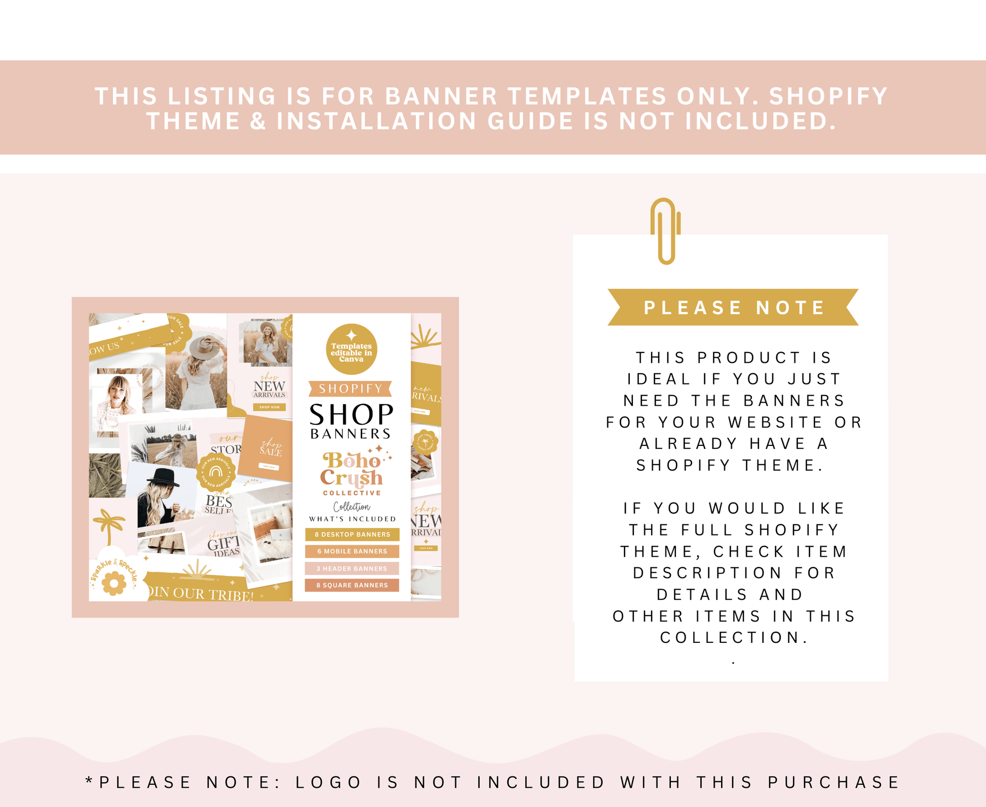 This listing is for banner templates only. Shopify Theme and Installation guide is not included. This product is ideal if you just need the banners for your website or you already have a Shopify Theme.