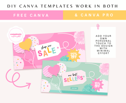 Each Shopify banner template is professionally designed and ready to be customized with your brand's colors, fonts, text, and product images. They’re pre-sized and optimized for both desktop and mobile, ensuring a polished, professional storefront that converts. You can open and update your templates at any time.
