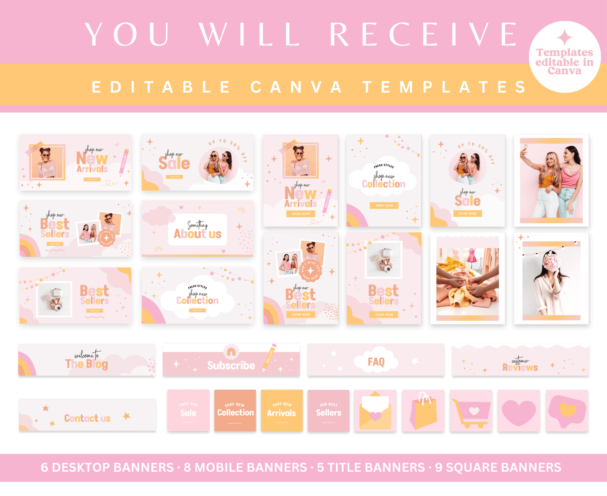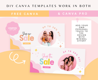 Transform your Shopify store with these vibrant pink orange website banner templates, easily editable in Canva! Personalize with your logo, highlight your unique selling points, and showcase your products for an eye-catching website. Ideal for small businesses, entrepreneurs, and boutiques ready to shine!"