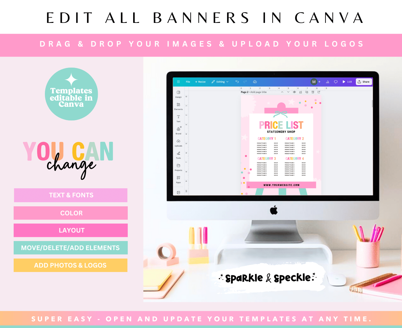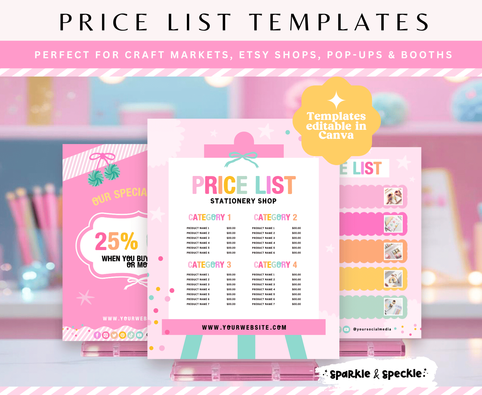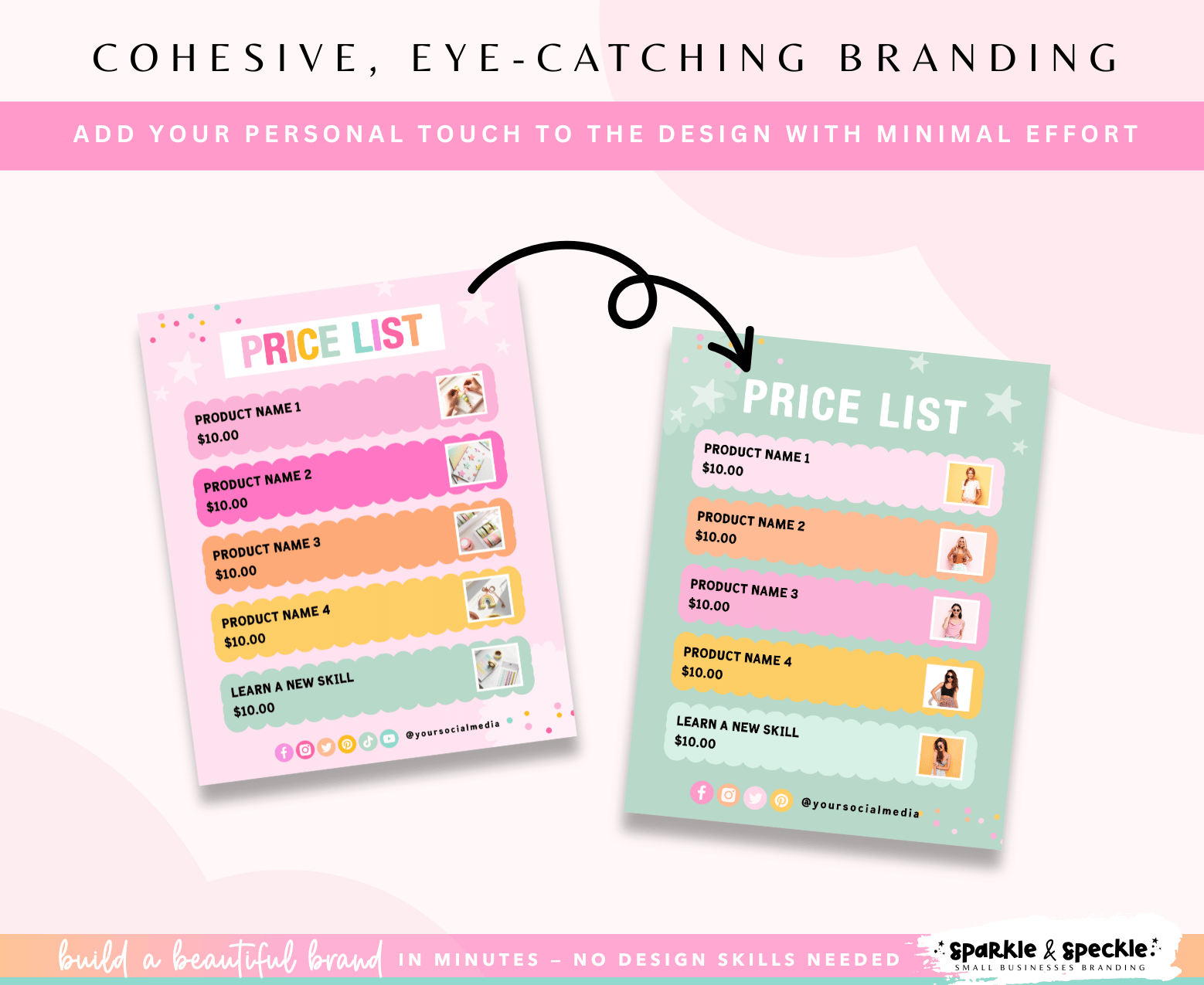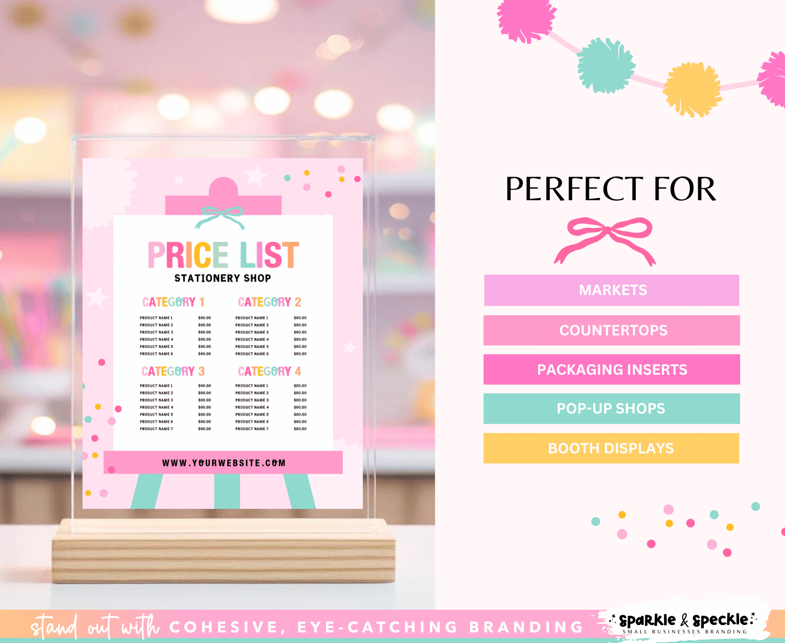 Editable price list template for Canva — make your pricing look as good as your products with this bold and colorful design. This vibrant price guide is perfect for craft sellers, stationery shops, market booths, and handmade brands who want their pricing to feel as polished as the rest of their branding.