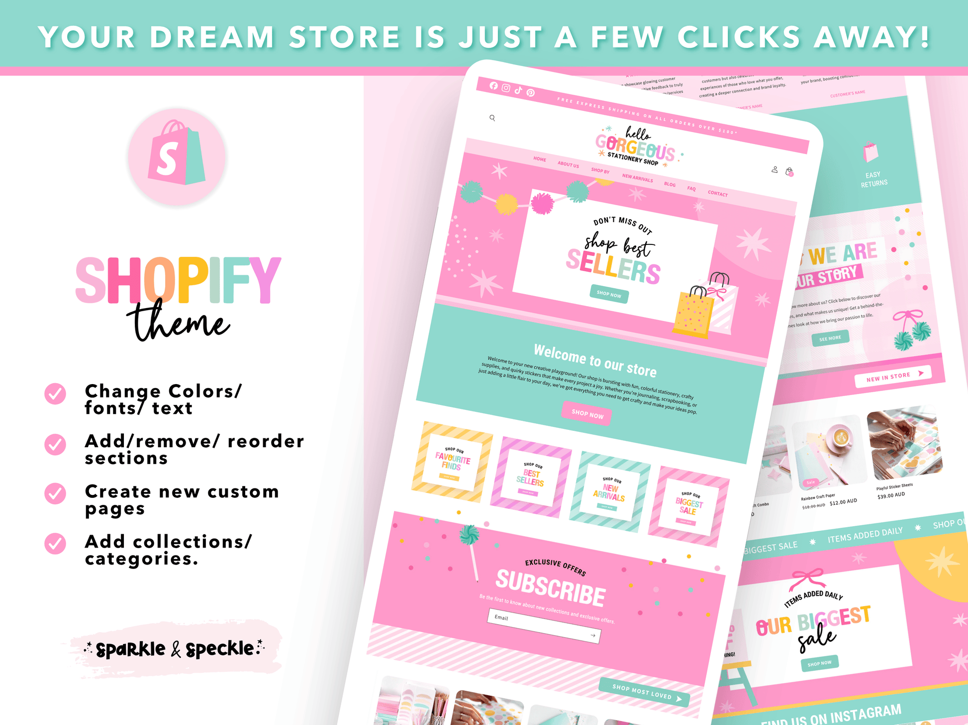 Bright pastel tones, cute stationery graphics, and playful accents create a joyful vibe that reflects your brand’s creativity. Optimized for fast loading and smooth navigation, this theme ensures a seamless shopping experience on any device. Plus, the easy drag-and-drop editor makes customizing your site effortless—no tech skills required.