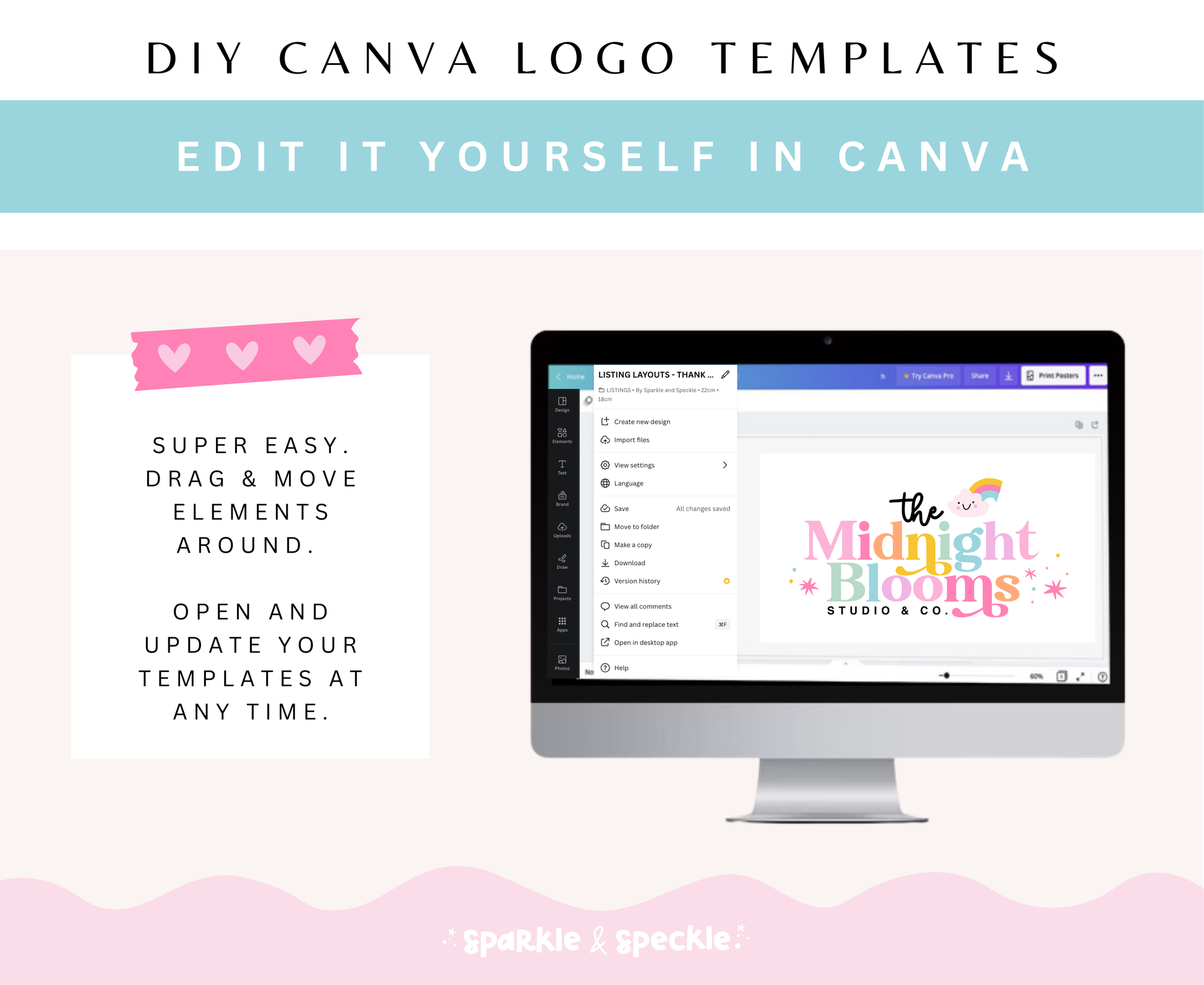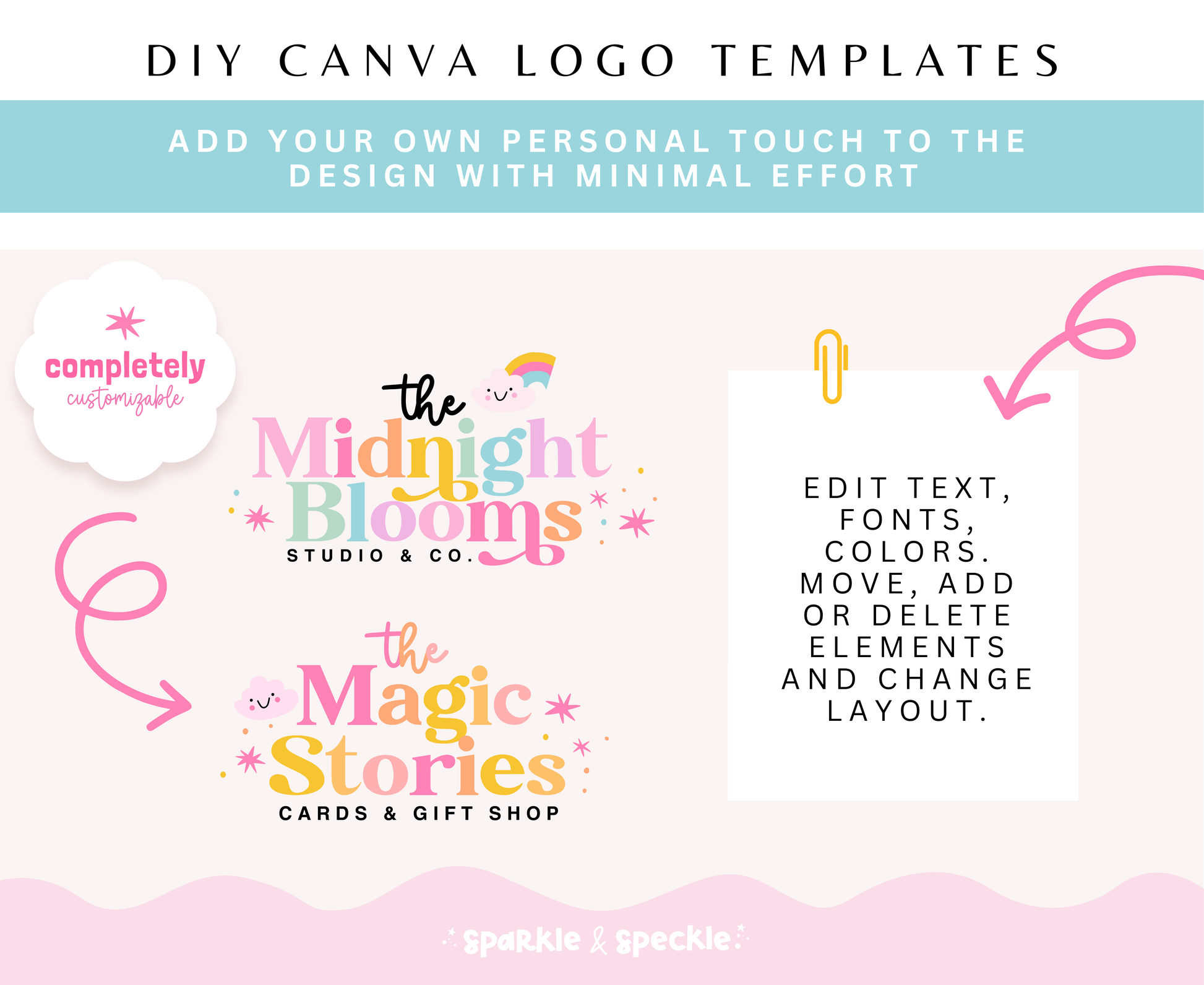 DIY fun and colorful smiley rainbow cloud logo template designed to be completely customizable in Canva. You have the freedom to personalize every aspect of this design to align it perfectly with your brand's aesthetic. Additionally, the custom-made font by Sparkle & Speckle adds a unique touch of originality and charm to your branding.