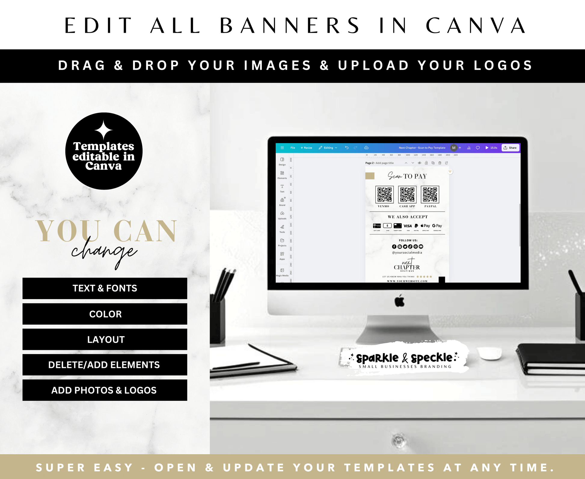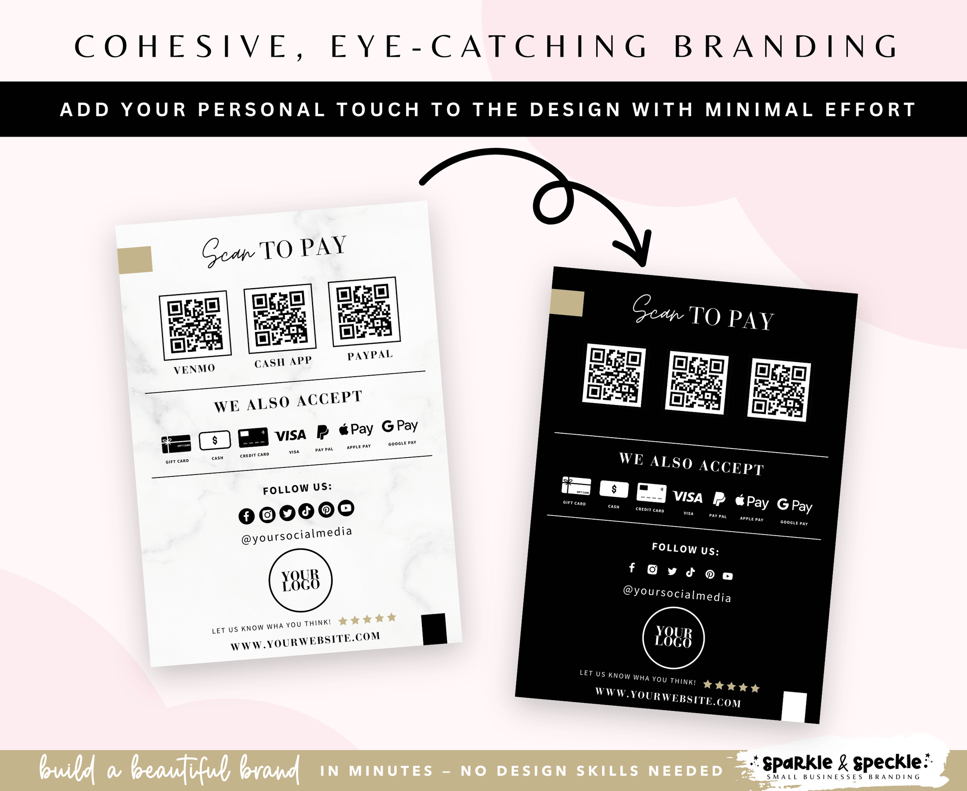 Upgrade your checkout experience with this sleek black Scan to Pay sign – the perfect blend of style and function for small businesses, pop-up shops, salons, makers, and creatives. This editable Canva template allows you to showcase multiple payment options like PayPal, Venmo, Google Pay, Visa, and more — making it easy for your customers to pay quickly and confidently.