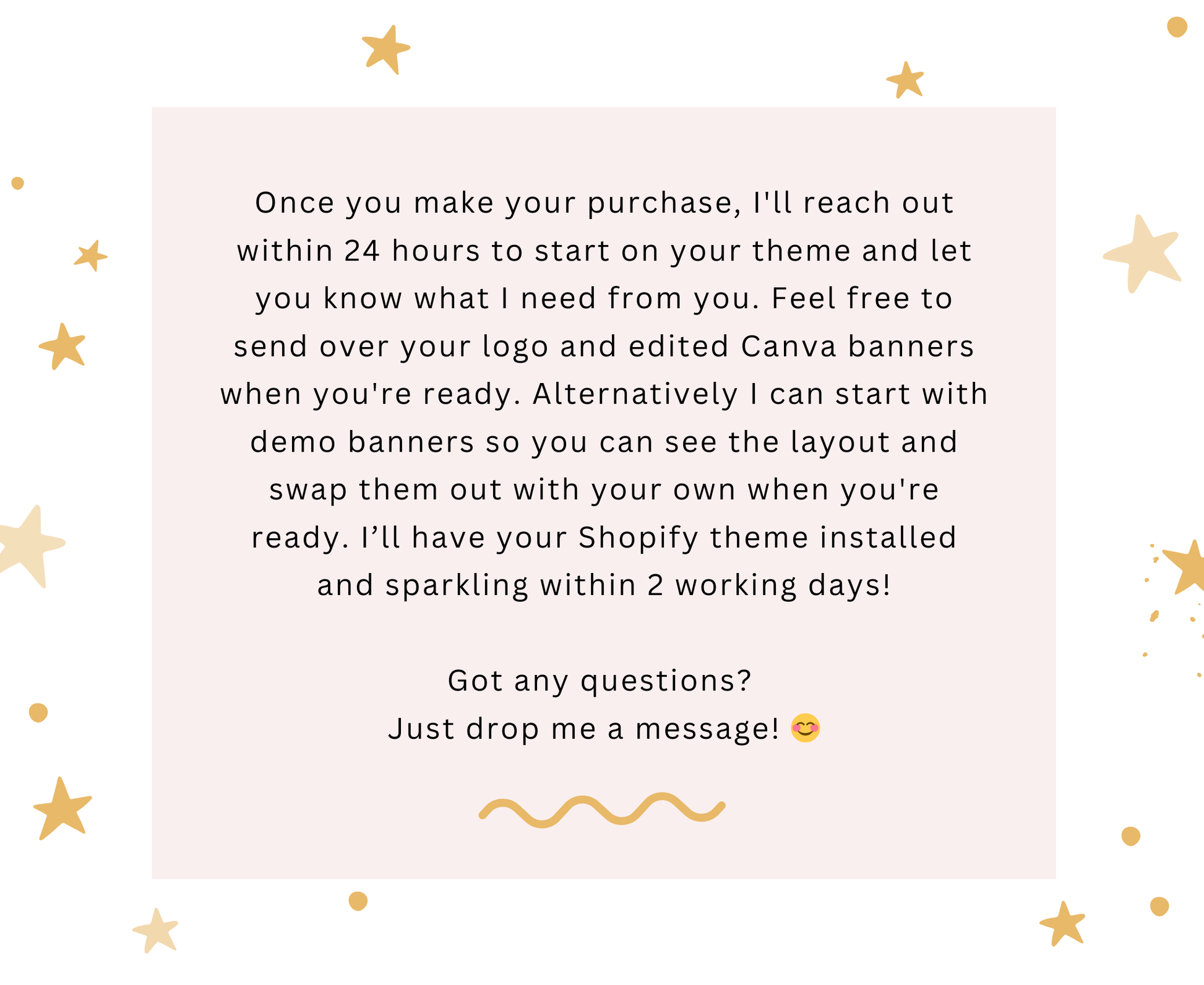 Once you make your purchase, I'll reach out within 24 hours to start on your theme and let you know what I need from you. Feel free to send over your logo and edited Canva banners when you're ready. Alternatively I can start with demo banners so you can see the layout and swap them out with your own when you're ready. I’ll have your Shopify theme installed and sparkling within 2 working days!