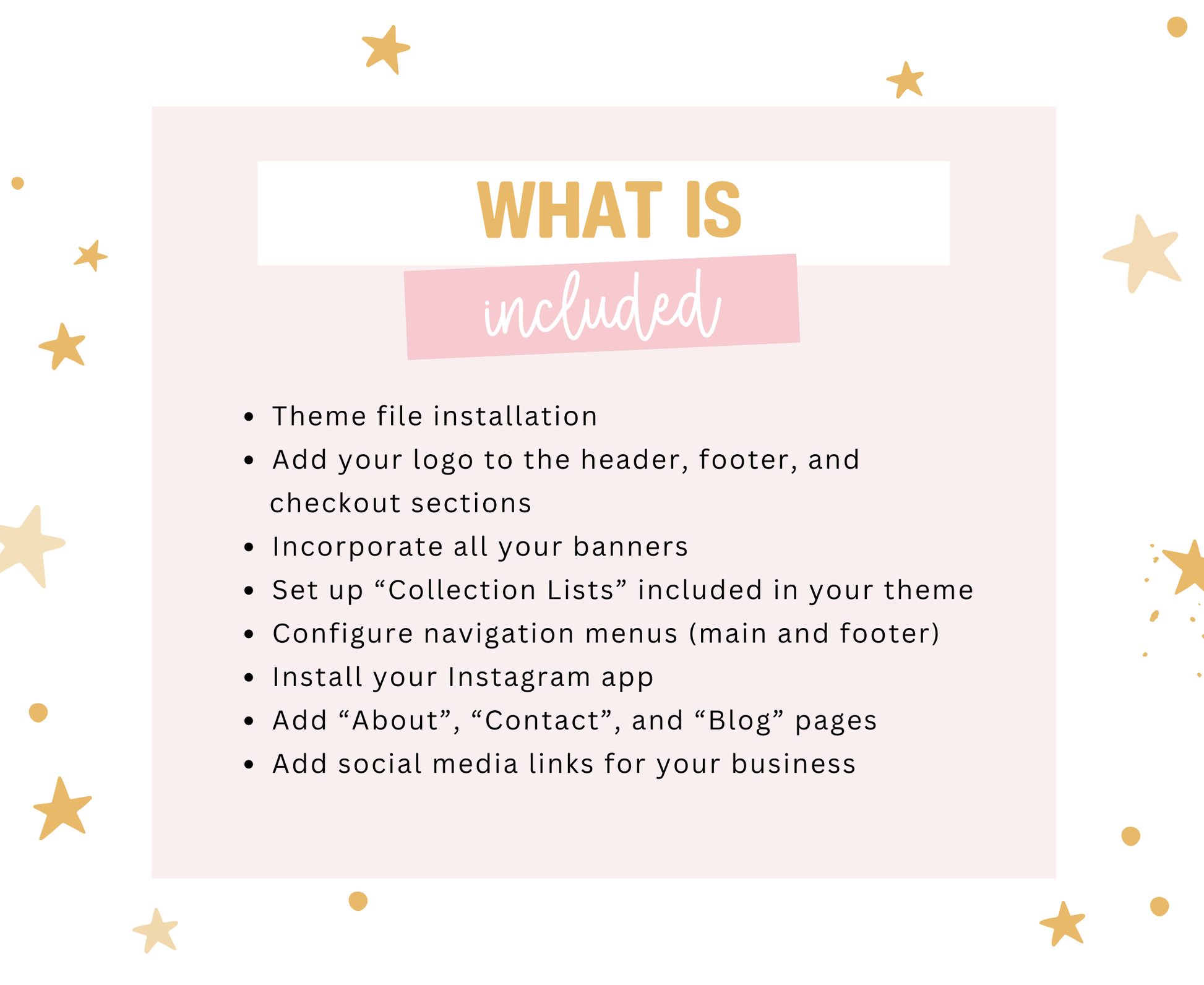 This listing is for the installation of a Shopify theme that you've already purchased from Sparkle & Speckle, or plan to purchase. If you haven't selected a theme yet, please visit the "Shopify Theme" section in our store and choose the theme you'd like to buy.